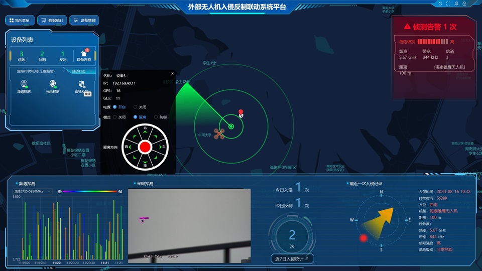 外部無人機(jī)入侵反制聯(lián)動(dòng)系統(tǒng)平臺(tái),通過獲取前端無人機(jī)探測(cè)設(shè)備和無人機(jī)反制設(shè)備的數(shù)據(jù),展示實(shí)時(shí)視頻畫面、設(shè)備分布、設(shè)備管理、告警界面以及無人機(jī)信息等,并采用GPS定位誘騙方式的反制技術(shù),誤導(dǎo)非法入侵無人機(jī)。為變電站圍墻內(nèi)外建立一道隱形的、可靠的“無人機(jī)隔離墻”,有效提高電力設(shè)備的安全性,保障電網(wǎng)設(shè)備安全穩(wěn)定運(yùn)行。
